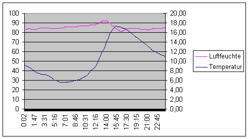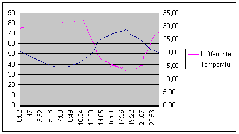 Für statistische Auswertungen und zur gelegentlichen Kontrolle der Werte im Gewächshaus gibt es heute sehr preiswerte Datenlogger. Diese sind oft kleiner als eine Zigarettenschachtel und speichern Temperatur und Luftfeuchte jeweils aller 5 Minuten. Der Speicher ist erst nach ca. 3 Monaten erschöpft. Diese Geräte kann man dann über USB mit einem PC verbinden und die Daten auslesen. In den folgenden Beispielen ist das Temperaturspeicherverhalten eine Kleingewächshauses schön zu sehen, ebenso der Verlauf der Luftfeuchte nach Öffnen der automatischen Fensterheber.